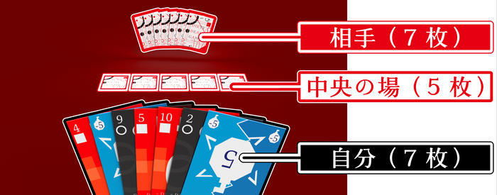 - 中央の場の5枚はこのように裏向きで並べておきます。これでゲームの準備が完了です。