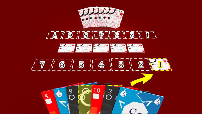 - 自分の番では、手札から好きなカード1枚を選んで裏向きで自分の場に置きます。このとき、 図のように自分の前に1枚目から順番に横に列になるように置いていきます。