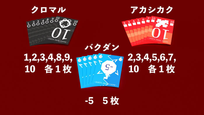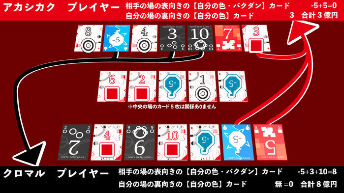 - 「19枚のカードを使用してゲームを行います。 そのうち5枚がバクダンカード。相手に与えるとマイナス5億円の損失を発生させることができます。残りの14枚のうち7枚が黒いカード、 7枚が赤いカードとなっております。プレイヤーはゲーム開始前に赤と黒の陣営に分かれます。ご自身の色のカードを獲得することで、1億円 × 数字分の現金を獲得します。たとえば、赤のプレイヤーが赤の7を獲得すればプラス7億円となります。4ラウンド終了時点で相手より多くの現金を獲得していればそれの差額分をそのまま賞金として獲得し、相手より多くの現金を獲得できなかったのならそれの差額分をそのまま負債として抱えていただきます。」