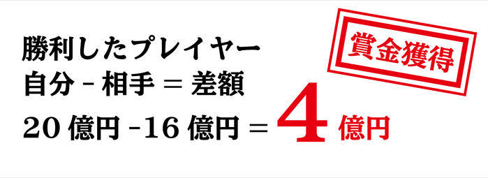 勝利したプレイヤーは自分の現金の合計金額と相手の現金の合計金額との差額を計算し、差額分を賞金として獲得します。