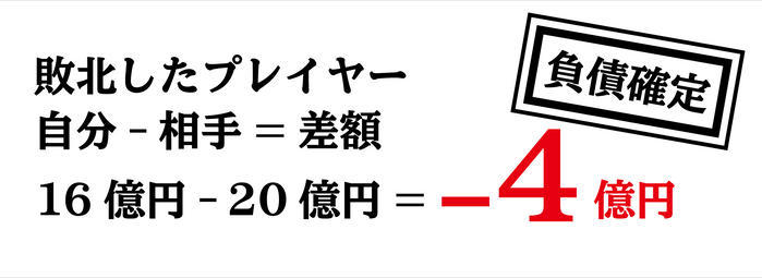 敗北したプレイヤーは自分の現金の合計金額と相手の現金の合計金額との差額を計算し、差額分をそのまま負債として抱えていただきます。