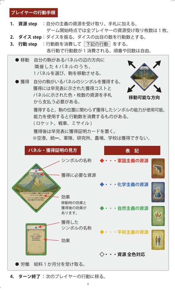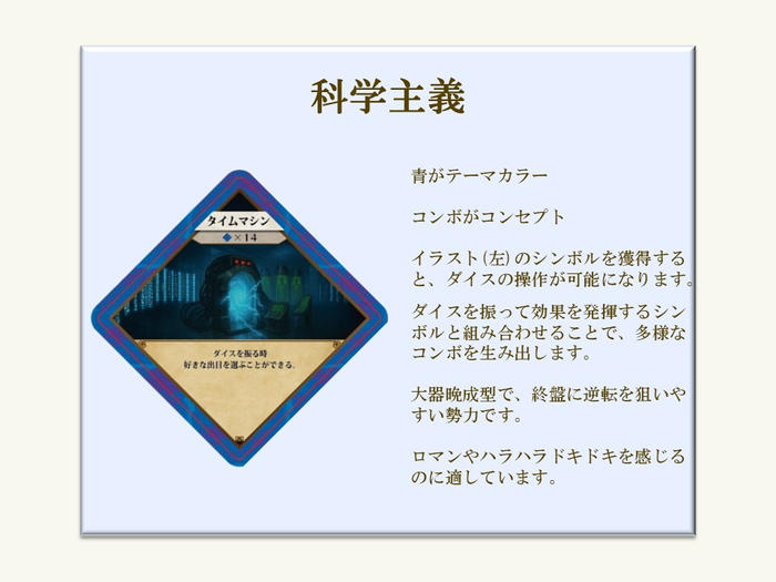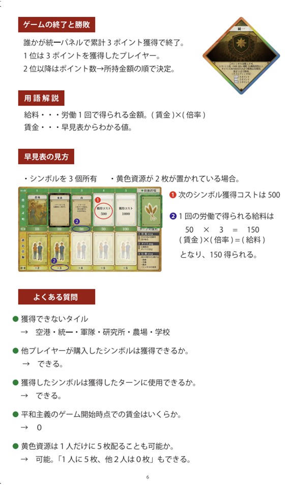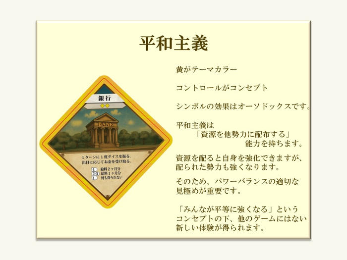 - シンボルは、お金を稼ぐ、資源を得る、行動数を増やす、お金を奪う、ダイスを操作すると様々な能力を持ちます。主義によって、各シンボルの獲得難易度が異なるため、個性が現れます。状況を見て、自身に必要なシンボルを選択するため、デッキを作るのが好きな人にもおすすめです。