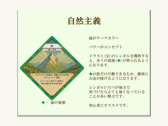 お金と資源という2種類のカードを扱うので様々な戦略が楽しめます。 -