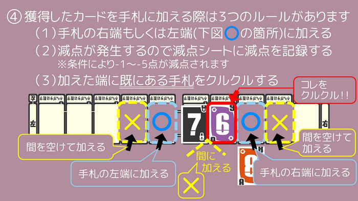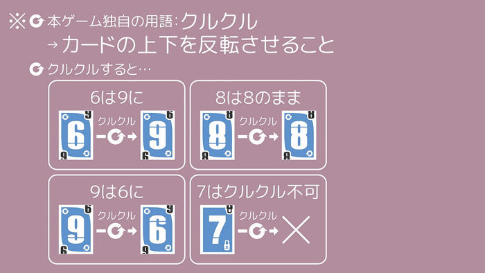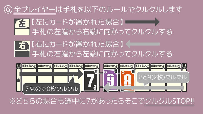ゲーム中、幾度となくやってくる「クルクル(※)」により、手札の上下が目まぐるしく変わっていきます。