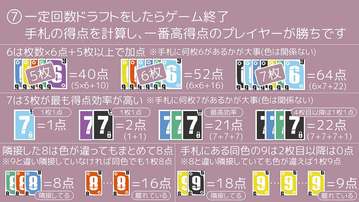 毎ターン1枚ずつカードをドラフトして手札に加えていき、ゲーム終了時に全プレイヤーの中で手札の得点が最も高くなることを目指します。