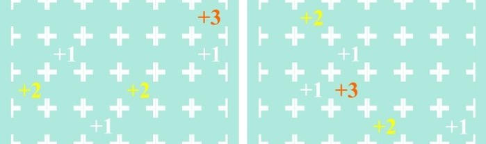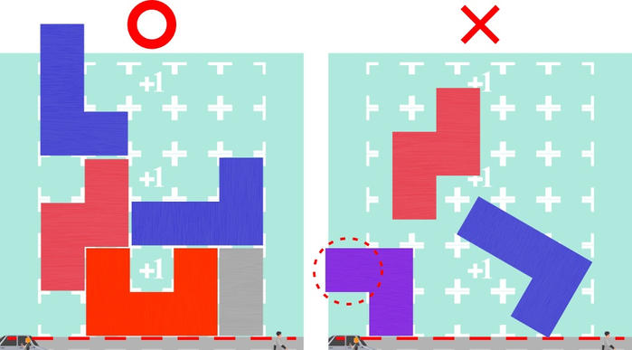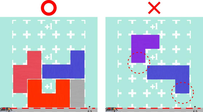 - ・ボード上に描かれているマスにしか配置できません。マスを無視した置き方は不可能です。また、ボードの左右に飛び出して配置することはできません。上から飛び出して配置することは可能ですが、ペナルティが発生します。