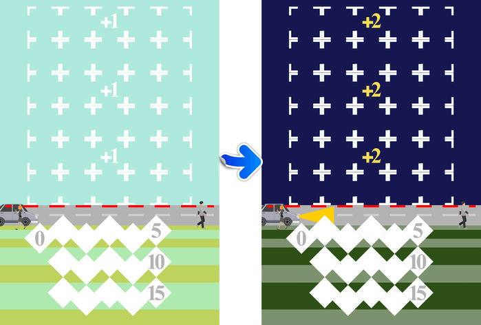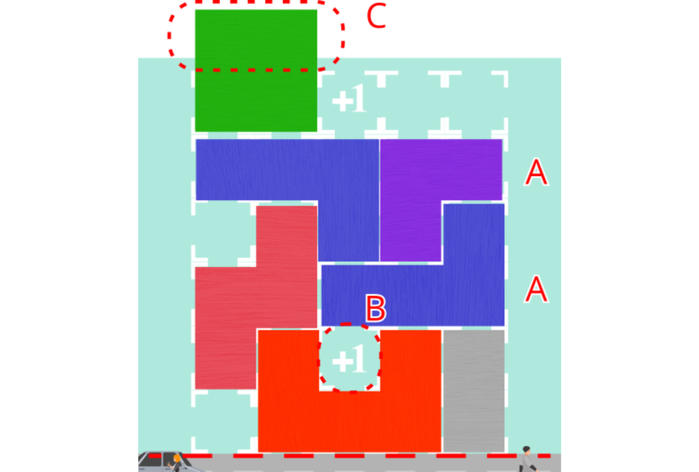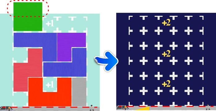 B.街ボード上に描かれている勝利点のうち、同じ列のほかのマスがすべて埋まっているものを獲得します。条件を満たしたマスごとに得点します。得点マスがミノによって隠されている場合、得点は入りません。