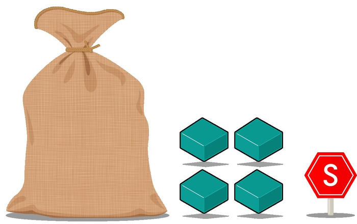 トークン×4、キューブ×40、麻袋×1、スタートプレイヤーマーカー×1(DX:同じ)