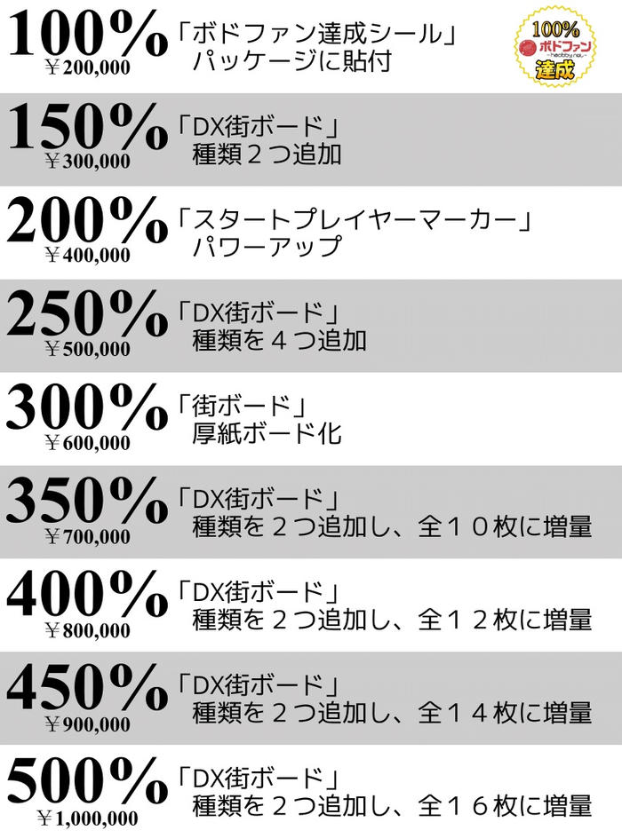 - 100%(¥200,000)「ボドファン達成シール」パッケージに貼付