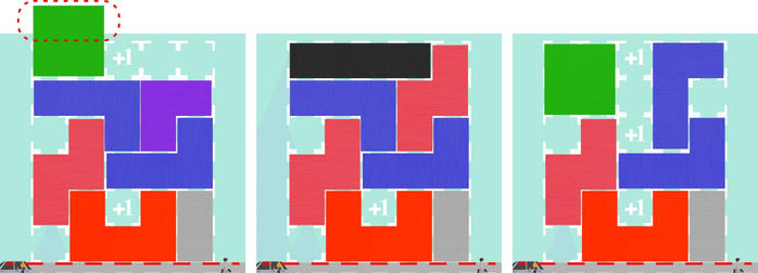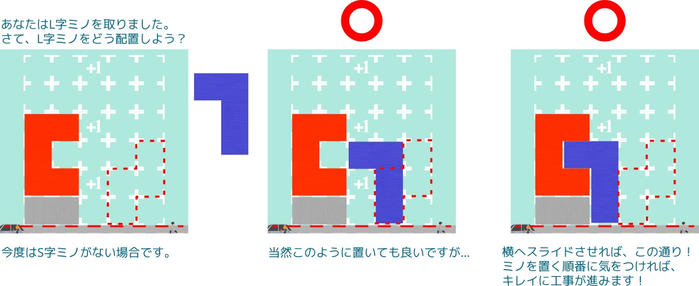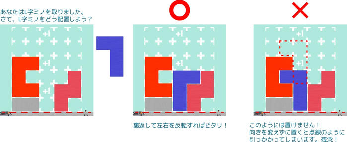 - ・ミノを配置する際にはミノの向きを決めてから、ボード上をスライドして行ける場所にしか配置できません。途中で引っかかるなどして進めない場合、そこに配置はできないことになります。