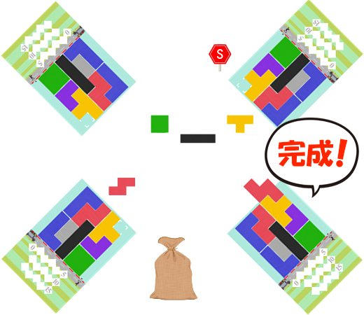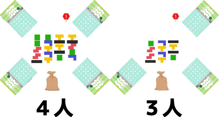 ・ランダマイザキューブを麻袋に入れ、プレイ人数+1個を引いてください。出た色のミノをミノ置き場から取り、ボードの横に縦一列になるように並べます。(これをサプライと呼びます。) -