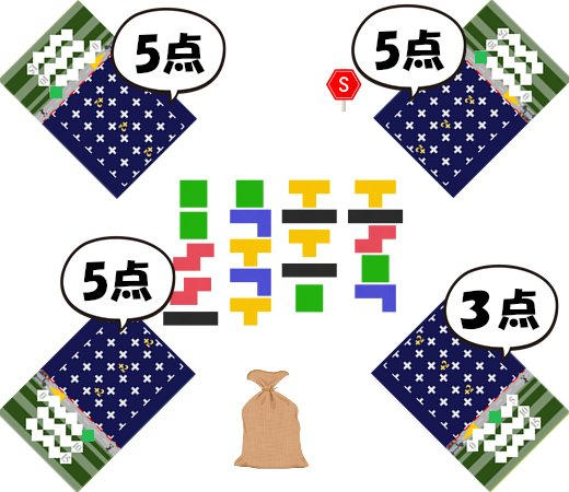 - ミノを取ったプレイヤーは、すぐに配置しなければなりません。
